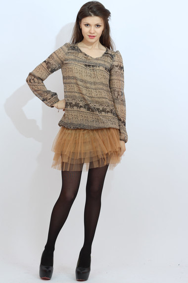 Воздушное платье с однотонной многоярусной шифоновой мини-юбкой и верхом с этническим рисунком - модный наряд для современной девушки.