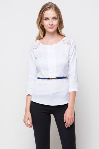 Изящная белая блузка с рукавами 3/4. Модель удлиненная, приталенного кроя, с красивой кружевной спинкой. В комплекте тонкий ремень темно-синего цвета.