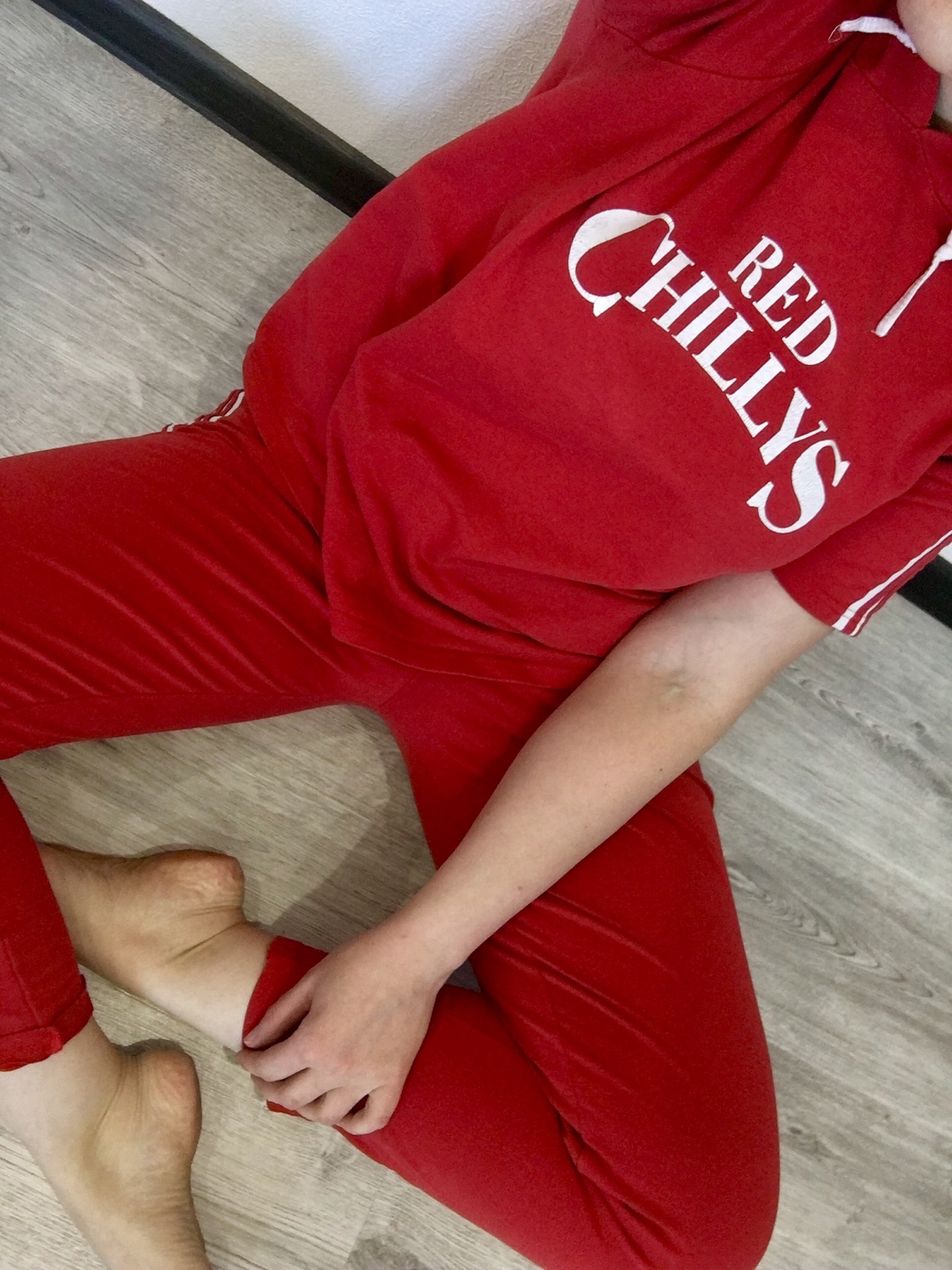 Детали одежды: укороченные брюки, пояс-резинка, небольшие кармашки, у толстовки капюшон
